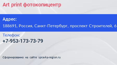 Art-print, фотокопицентр по адресу 188691, Россия, Санкт-Петербург, проспект Строителей, 6 в дальнейшем Организация, размещена в следующих категориях:
