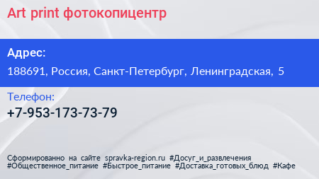 Art-print, фотокопицентр по адресу 188691, Россия, Санкт-Петербург, Ленинградская, 5 в дальнейшем Организация, размещена в следующих категориях:
