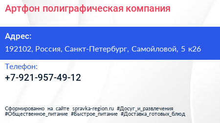 Артфон, полиграфическая компания по адресу 192102, Россия, Санкт-Петербург, Самойловой, 5 к26 в дальнейшем Организация, размещена в следующих категориях: