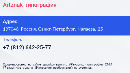 Artznak, типография по адресу 197046, Россия, Санкт-Петербург, Чапаева, 25 в дальнейшем Организация, размещена в следующих категориях: