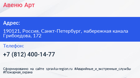 Авеню-Арт по адресу 190121, Россия, Санкт-Петербург, набережная канала Грибоедова, 172 в дальнейшем Организация, размещена в следующих категориях: