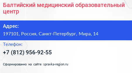 Балтийский медицинский образовательный центр по адресу 197101, Россия, Санкт-Петербург, Мира, 14 в дальнейшем Организация, размещена в следующих категориях: