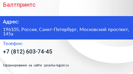 Балтпринтс по адресу 196105, Россия, Санкт-Петербург, Московский проспект, 145а в дальнейшем Организация, размещена в следующих категориях: