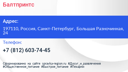 Балтпринтс по адресу 197110, Россия, Санкт-Петербург, Большая Разночинная, 24 в дальнейшем Организация, размещена в следующих категориях: