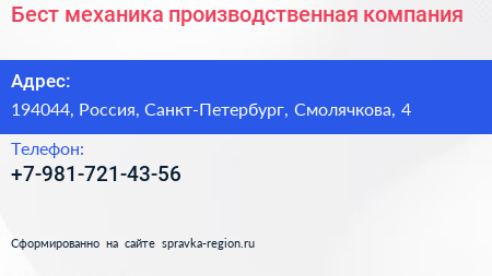 Бест-механика, производственная компания по адресу 194044, Россия, Санкт-Петербург, Смолячкова, 4 в дальнейшем Организация, размещена в следующих категориях: