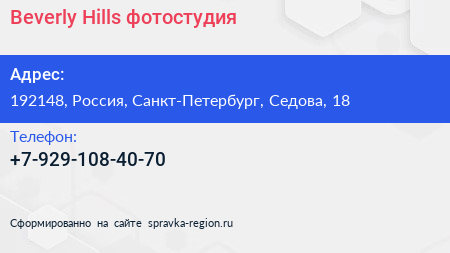 Beverly Hills, фотостудия по адресу 192148, Россия, Санкт-Петербург, Седова, 18 в дальнейшем Организация, размещена в следующих категориях: