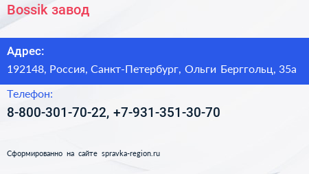 Bossik, завод по адресу 192148, Россия, Санкт-Петербург, Ольги Берггольц, 35а в дальнейшем Организация, размещена в следующих категориях: