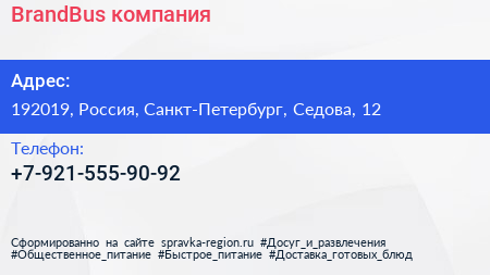 BrandBus, компания по адресу 192019, Россия, Санкт-Петербург, Седова, 12 в дальнейшем Организация, размещена в следующих категориях: