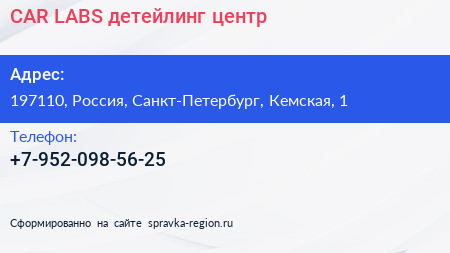 CAR-LABS, детейлинг-центр по адресу 197110, Россия, Санкт-Петербург, Кемская, 1 в дальнейшем Организация, размещена в следующих категориях: