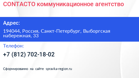 CONTACTO, коммуникационное агентство по адресу 194044, Россия, Санкт-Петербург, Выборгская набережная, 33 в дальнейшем Организация, размещена в следующих категориях: