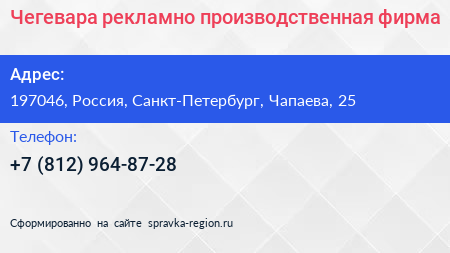 Чегевара, рекламно-производственная фирма по адресу 197046, Россия, Санкт-Петербург, Чапаева, 25 в дальнейшем Организация, размещена в следующих категориях: