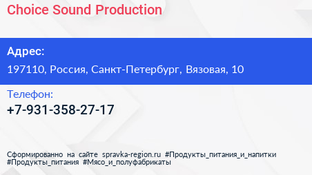 Choice Sound Production по адресу 197110, Россия, Санкт-Петербург, Вязовая, 10 в дальнейшем Организация, размещена в следующих категориях: