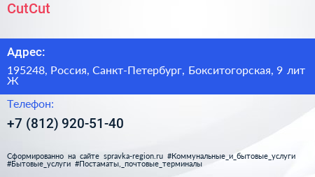 CutCut по адресу 195248, Россия, Санкт-Петербург, Бокситогорская, 9 лит Ж в дальнейшем Организация, размещена в следующих категориях: