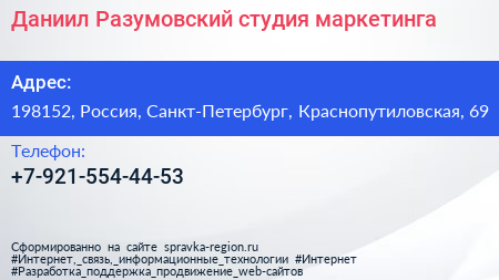 Даниил Разумовский, студия маркетинга по адресу 198152, Россия, Санкт-Петербург, Краснопутиловская, 69 в дальнейшем Организация, размещена в следующих категориях: