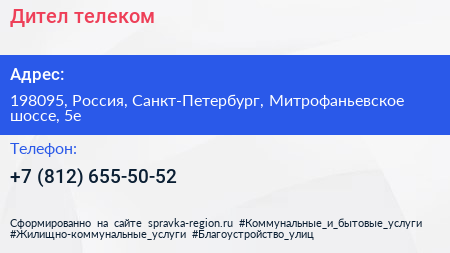 Дител телеком по адресу 198095, Россия, Санкт-Петербург, Митрофаньевское шоссе, 5е в дальнейшем Организация, размещена в следующих категориях: