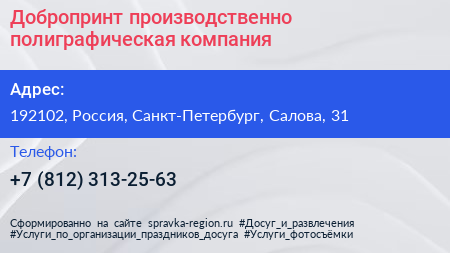 Добропринт, производственно-полиграфическая компания по адресу 192102, Россия, Санкт-Петербург, Салова, 31 в дальнейшем Организация, размещена в следующих категориях: