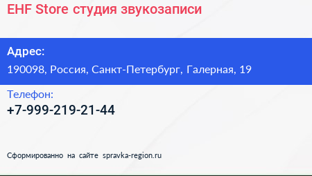 EHF Store, студия звукозаписи по адресу 190098, Россия, Санкт-Петербург, Галерная, 19 в дальнейшем Организация, размещена в следующих категориях: