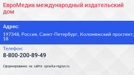 ЕвроМедиа, международный издательский дом по адресу 197348, Россия, Санкт-Петербург, Коломяжский проспект, 18 в дальнейшем Организация, размещена в следующих категориях: