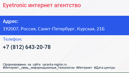Eyetronic, интернет-агентство по адресу 192007, Россия, Санкт-Петербург, Курская, 21Б в дальнейшем Организация, размещена в следующих категориях:
