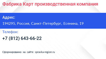 Фабрика Карт, производственная компания по адресу 194295, Россия, Санкт-Петербург, Есенина, 19 в дальнейшем Организация, размещена в следующих категориях: