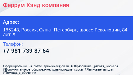 Феррум Хэнд, компания по адресу 195248, Россия, Санкт-Петербург, шоссе Революции, 84 лит Х в дальнейшем Организация, размещена в следующих категориях: