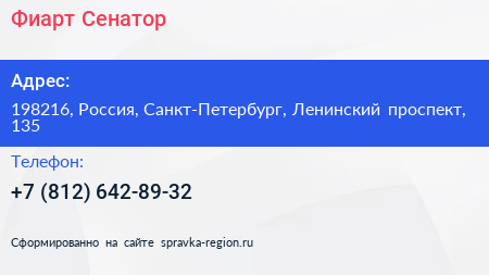 Фиарт-Сенатор по адресу 198216, Россия, Санкт-Петербург, Ленинский проспект, 135 в дальнейшем Организация, размещена в следующих категориях: