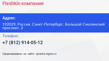 Fleshkin, компания по адресу 192029, Россия, Санкт-Петербург, Большой Смоленский проспект, 2 в дальнейшем Организация, размещена в следующих категориях: