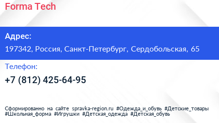 Forma Tech по адресу 197342, Россия, Санкт-Петербург, Сердобольская, 65 в дальнейшем Организация, размещена в следующих категориях: