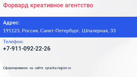 Форвард, креативное агентство по адресу 191123, Россия, Санкт-Петербург, Шпалерная, 33 в дальнейшем Организация, размещена в следующих категориях: