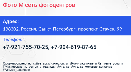 Фото-М, сеть фотоцентров по адресу 198302, Россия, Санкт-Петербург, проспект Стачек, 99 в дальнейшем Организация, размещена в следующих категориях: