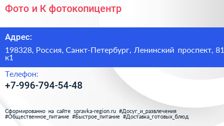 Фото и К*, фотокопицентр по адресу 198328, Россия, Санкт-Петербург, Ленинский проспект, 81 к1 в дальнейшем Организация, размещена в следующих категориях: