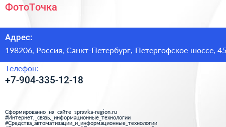 ФотоТочка по адресу 198206, Россия, Санкт-Петербург, Петергофское шоссе, 45 в дальнейшем Организация, размещена в следующих категориях: