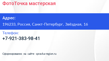 ФотоТочка, мастерская по адресу 196233, Россия, Санкт-Петербург, Звёздная, 16 в дальнейшем Организация, размещена в следующих категориях: