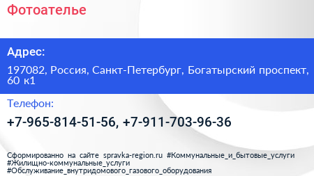 Фотоателье по адресу 197082, Россия, Санкт-Петербург, Богатырский проспект, 60 к1 в дальнейшем Организация, размещена в следующих категориях: