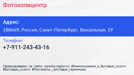 Фотокопицентр по адресу 188669, Россия, Санкт-Петербург, Вокзальная, 19 в дальнейшем Организация, размещена в следующих категориях: