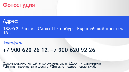 Фотостудия по адресу 188692, Россия, Санкт-Петербург, Европейский проспект, 18 к1 в дальнейшем Организация, размещена в следующих категориях: