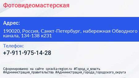 Фотовидеомастерская по адресу 190020, Россия, Санкт-Петербург, набережная Обводного канала, 134-138 к231 в дальнейшем Организация, размещена в следующих категориях: