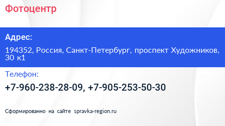 Фотоцентр по адресу 194352, Россия, Санкт-Петербург, проспект Художников, 30 к1 в дальнейшем Организация, размещена в следующих категориях: