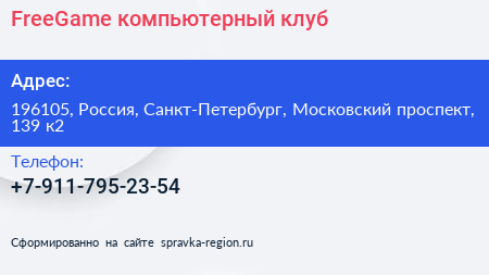 FreeGame, компьютерный клуб по адресу 196105, Россия, Санкт-Петербург, Московский проспект, 139 к2 в дальнейшем Организация, размещена в следующих категориях: