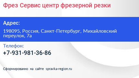 Фрез Сервис, центр фрезерной резки по адресу 198095, Россия, Санкт-Петербург, Михайловский переулок, 7а в дальнейшем Организация, размещена в следующих категориях: