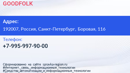 GOODFOLK по адресу 192007, Россия, Санкт-Петербург, Боровая, 116 в дальнейшем Организация, размещена в следующих категориях: