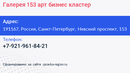 Галерея 153, арт-бизнес кластер по адресу 191167, Россия, Санкт-Петербург, Невский проспект, 153 в дальнейшем Организация, размещена в следующих категориях: