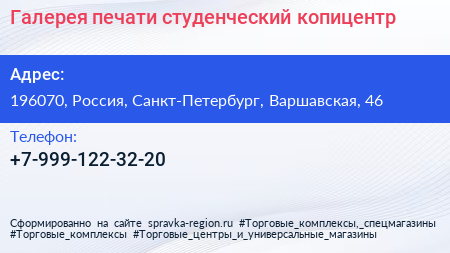 Галерея печати, студенческий копицентр по адресу 196070, Россия, Санкт-Петербург, Варшавская, 46 в дальнейшем Организация, размещена в следующих категориях: