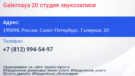 Galernaya 20, студия звукозаписи по адресу 190098, Россия, Санкт-Петербург, Галерная, 20 в дальнейшем Организация, размещена в следующих категориях: