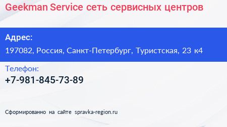 Geekman Serviсe, сеть сервисных центров по адресу 197082, Россия, Санкт-Петербург, Туристская, 23 к4 в дальнейшем Организация, размещена в следующих категориях:
