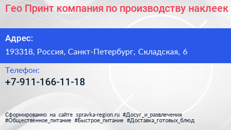 Гео-Принт, компания по производству наклеек по адресу 193318, Россия, Санкт-Петербург, Складская, 6 в дальнейшем Организация, размещена в следующих категориях: