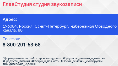 ГлавСтудия, студия звукозаписи по адресу 196084, Россия, Санкт-Петербург, набережная Обводного канала, 88 в дальнейшем Организация, размещена в следующих категориях: