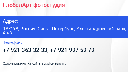 ГлобалАрт, фотостудия по адресу 197198, Россия, Санкт-Петербург, Александровский парк, 4 к3 в дальнейшем Организация, размещена в следующих категориях: