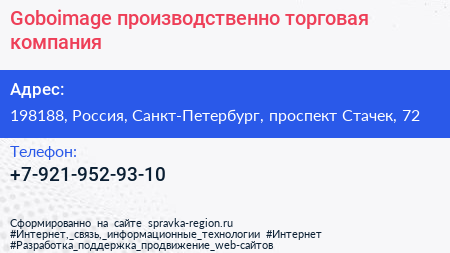 Goboimage, производственно-торговая компания по адресу 198188, Россия, Санкт-Петербург, проспект Стачек, 72 в дальнейшем Организация, размещена в следующих категориях: