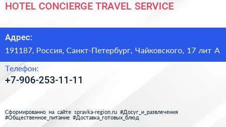 HOTEL CONCIERGE TRAVEL SERVICE по адресу 191187, Россия, Санкт-Петербург, Чайковского, 17 лит А в дальнейшем Организация, размещена в следующих категориях: